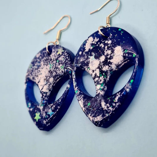 Cosmic Steve deep blue and silver spatter earrings. Glow in the dark.